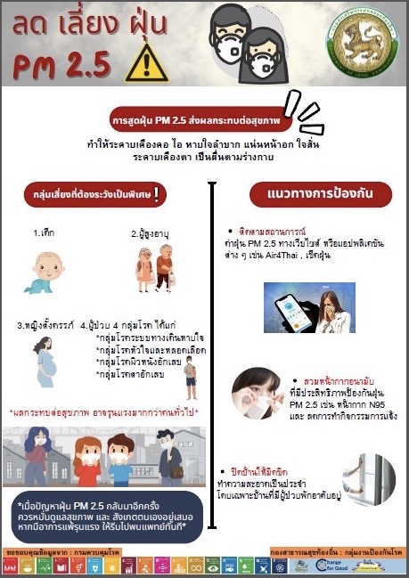 รายละเอียด : ประชาสัมพันธ์ การเฝ้าระวังภัยและผลกระทบต่อสุขภาพจากฝุ่นละอองขนาดเล็กในบรรยากาศ (PM2.5)##