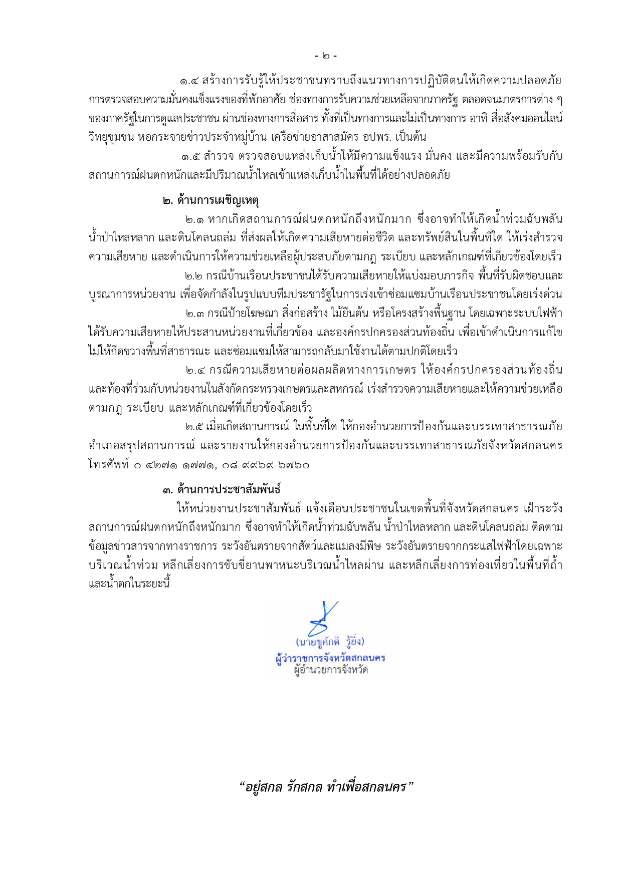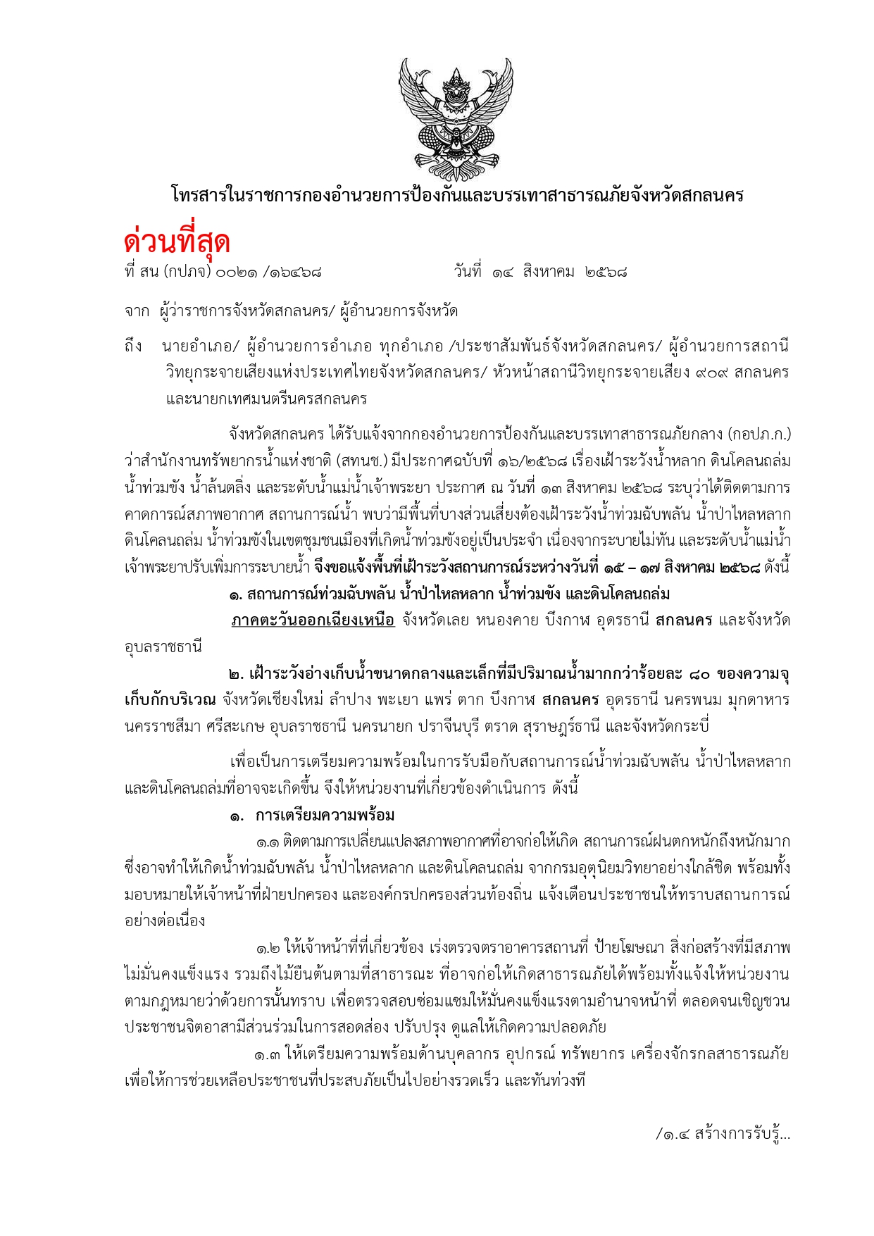 ชื่อเรื่อง : กองอำนวยการป้องกันและบรรเทาสาธารณภัยจังหวัดสกลนคร แจ้งเตือนเฝ้าระวังสถานการณ์อุทกภัย ในระหว่างวันที่ 15 - 17 สิงหาคม 2568 เพื่อให้หน่วยงานดำเนินการในส่วนที่เกี่ยวข้องต่อไป